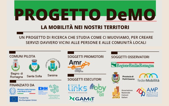 Il Progetto DeMO è un progetto pilota, unico in Italia, che coinvolge alcuni comuni tra cui Sarsina e ha come obiettivo primario, attraverso la raccolta di informazioni sulle abitudini di mobilità dei cittadini, la costruzione/progettazione di servizi di mobilità adatti alla nostra comunità valutando le esigenze delle persone nel territorio.